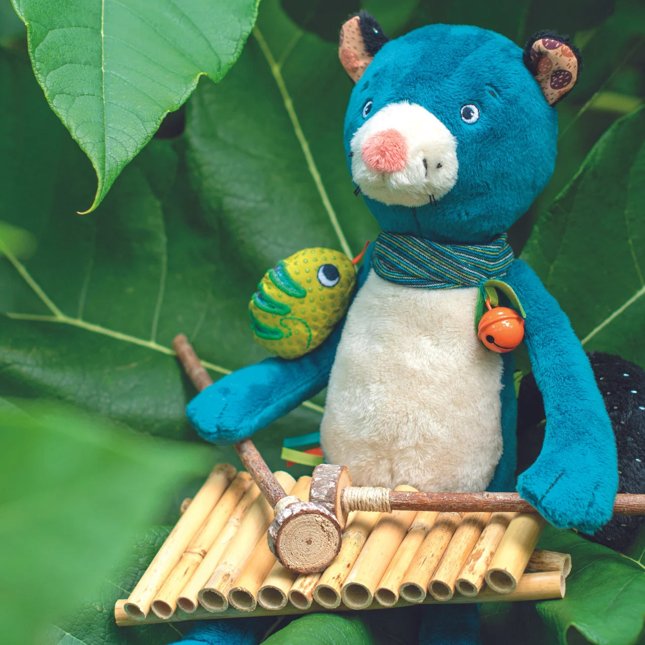 For future musicians, a wooden guitar with 6 metal strings like the professionals! Painted in blue and brick, it is illustrated with a panther motif and flying feathers around the rosette. Develops the rhythm, motor skills and musical awakening of the little ones.